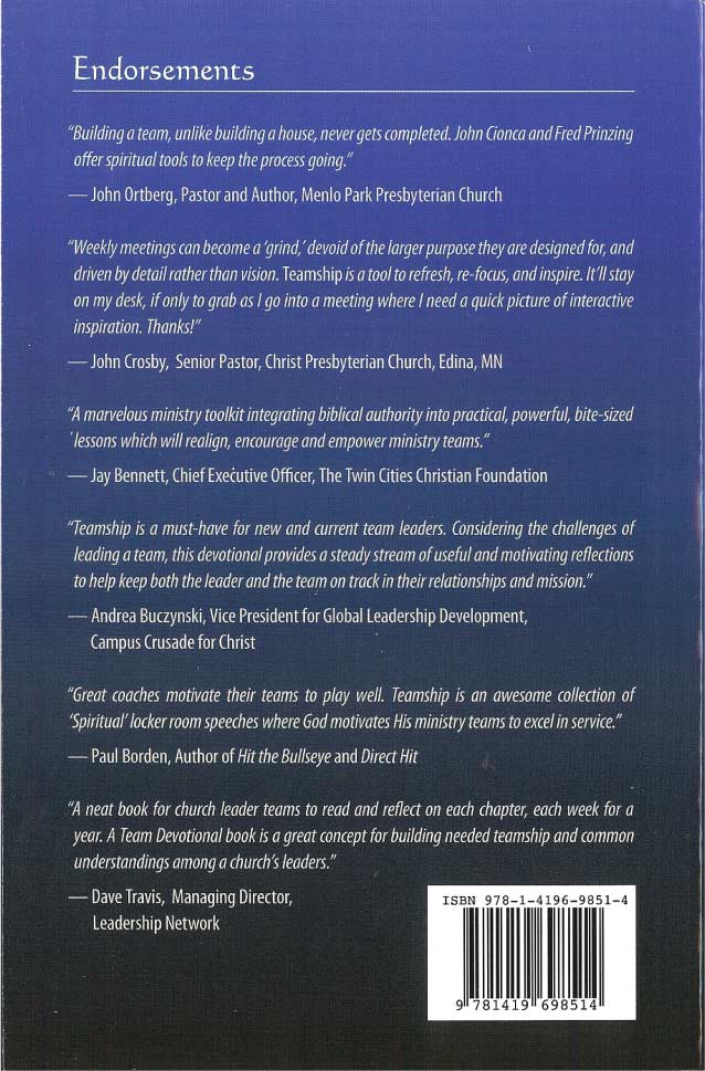 Teamship is designed to enable leadership teams to look at some of these case studies for guidance in their work together. The subtitle of this work denotes its desire to be inspirational-a means of drawing you closer to the Master. The work also aspires to be a coaching tool-providing advice on relational ministry.